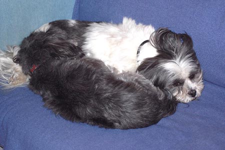 Posted: September 16, 2007 Filed under: FFT Lhasa Apsos Comments Off on Aaron and Taschi-DelegAaron – Champion Byrnwood Fleetfire Primal Fear – will be nine years old in October. Taschi-Deleg – a Gompa dog – was ten years old this past April. Elizabeth send these photos, showing the two sleeping together on the couch and the bed. Both male dogs lived in my kennel until each contributed to their perspective breeding program.