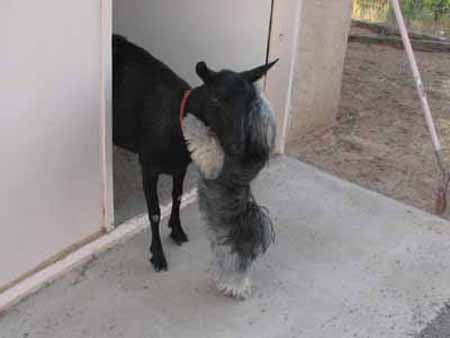 Posted: September 18, 2007 Filed under: FFT Lhasa Apsos 4 CommentsThis is Maggie, mother of the twins born earlier this year, finishing up in the milking shed, heading back to the goat pen. Zeke always gives her a hug on the way out, and they interact for a minute or two. They are good friends. Maggie has never shown any fear of him; on the contrary, she was attracted to him from the beginning. He loves to drink his bowl of warm Maggie Milk every morning, and lick our Goat Milk Ice Cream bowls in the evening.