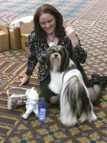 Posted: November 1, 2007 Filed under: FFT Lhasa Apsos | Tags: Debby Rothman, Julie Timbers 4 CommentsVickie loves this photo of Josie and Melissa. And, so do I. Notice both Josie and the Foodog are in the same pose! I’ve spent the past several days compiling photos, sent to me by various people, from National Specialty week. In about a half hour, I’m out the door for a quick road trip to meet up with Julie in Lincoln, Nebraska, collect several dogs including Edie Bedie, dog talk and celebrate Fernando’s accomplishments. In the meantime, enjoy these photos.