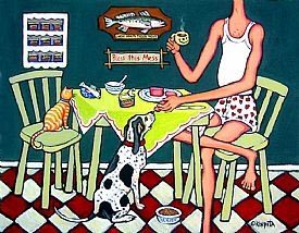 The cartoon reminds me of Roadie and me at times. I give him treats when he comes in from outside . He likes the Pedigree marrow bones the little round ones which is like a biscuit with the marrow inside.