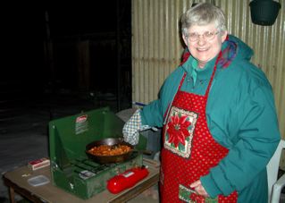 Since the wee fire destroying the stove, we have improvised!! Notice I am dressed in layers to keep warm!! Dinner is served on the patio, complete with lantern light and 3 smiling dogs!!