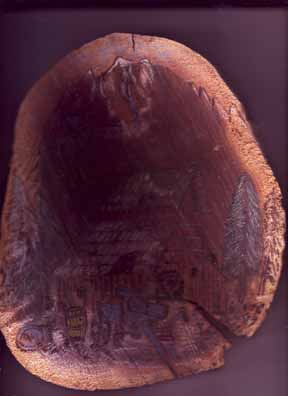 My dad was nine years old in 1942. That is not his handwriting. I wondered about the significance of the card. Why was it saved? Who sent it? I shared the card and my questions with our friends Kevin and Melissa as we feasted on Chinese take-out. They suggested it was an art project with assistance from a teacher. That would explain the handwriting. Palmer method, for sure. A light bulb went on! Could dad have drawn the picture? Quickly I retrieved two wood burnings by dad…