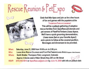 While it has been a long-time coming, we’ve finally got solid plans … and a beautiful site to hold our first ever Rescue Reunion. Right about now, you’re probably asking yourself what exactly is a “rescue reunion.” Simply stated, it is a gathering of all the families (and dogs) that have adopted from our organization. Date for the event: June 21, 2008 from 10:00 a.m. to 2:00 p.m. UPDATE ON LOCATION: Due to a scheduling conflict, we’ve reserved space at Thompson Park, located 4 blocks west of Main Street (Hwy 287) on 5th Street in Longmont. Why Longmont? We have families all over the Front Range and Longmont is the most central (not to mention it is a nice little city away from the hustle/bustle of Denver).