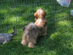 Saturday, Vickie’s Dante (BISS Ch. FFT Kisses of Fire) won Best of Breed and made the cut in the group. Ginny’s Ethan (FFT Midnight Flamenco Dancer) was Winners Dog and Best of Winners for another point. By default, Jill (FFT She Tsabo Do U Know Jill – littersister to U Don’t Know Jack) was Best Lhasa Apso Puppy. Jill turned 6 months old the day before. This was her first show. After showing Wyatt (who started puppy coat blow big time) three weeks ago and Silly Jillian yesterday, Tammy’s probably ready to shoot me! Jill gaited on her two hind legs, trying to climb Tammy’s leg and ruining her panty hose. Today Tammy is wearing slacks in the ring! Now, my purpose for Jill’s weekend was training, expose her to the sights, sounds and confusion of a dog show. That she kept her tail up is a Victory! in my book.
