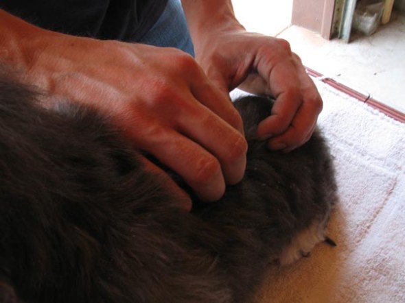 Currently, I’m working his entire spine – with the exception of the curve – rocking it vertebrae by vertebrae. This is to keep the rest of his spine flexible; the body protects injured areas by tensing up muscles surrounding the injury. At either end of the C, I’m applying pressure at the misalignment. I’m rotating the C curve, vertebrae by vertebrae, placing my entire hands along the spine, rotating to the left. Finally, my ragtag physical therapy continues, incorporating tactile irritation (tugging the skin and hair of his rear quarters). I begin by positioning Dorje’s rear legs under him. Gently applying pressure, I balance his resistance to the pressure (he pushes up into my hand) so he’s able to remain standing rather than sitting. I also put my hands on either side of him, close to his thighs, gently push him from side to side, again using his body signals to determine how far I push him. Yesterday I incorporated foot stimulation. I hold him similar to cradling a baby, but so that his hind legs can move freely (if you can call it that!!). I massage between each toe with very firm pressure. He is able to pull each foot away when the pressure is too much.