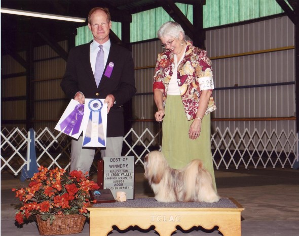 Next day’s Specialty was judged by long-time judge, former breeder of Lhasa Apsos and author of Your Lhasa Apso, Dr. Robert Berndt. Dr. Berndt is noted for judging bites. He doesn’t tolerate scissor bites; he wants full dentition. I thought about not entering Edie because she has four lower incisors instead of six. But what the heck?! I’d driven all that way. She’d be groomed. Might as well toss another entry fee to the wind! Am I glad I did!!
