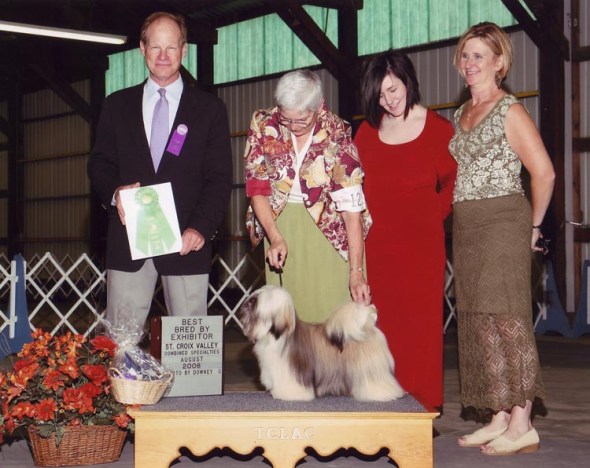 Thateus has had an equally exciting whirlwind show career. At least this part of his career. He’s now officially Ch. FFT That’s What I Said, but he’s probably not done in the show ring. Heck, he doesn’t yet know how to stand totally still for examination. Thursday, under Michael Doughtery he was awarded Best Bred-By Exhibitor in Specialty show…