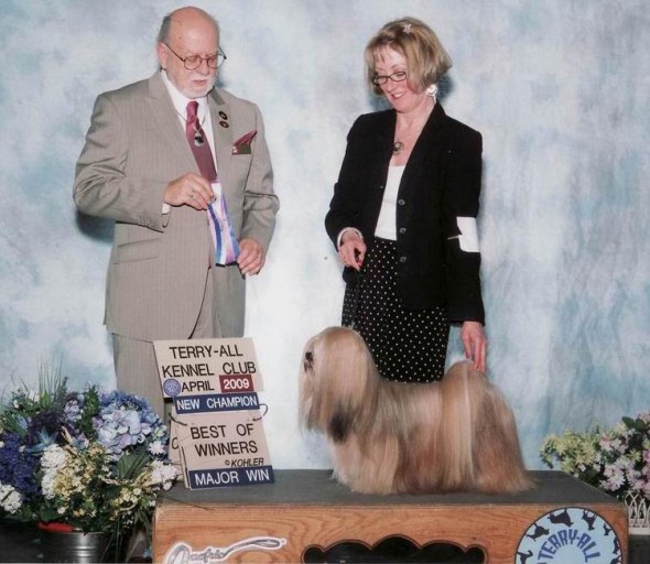 Here’s a photo of Ginny and Ethan, taken the day he finished his Championship, from the Bred-By-Exhibitor class under breeder/judge Richard Camacho…