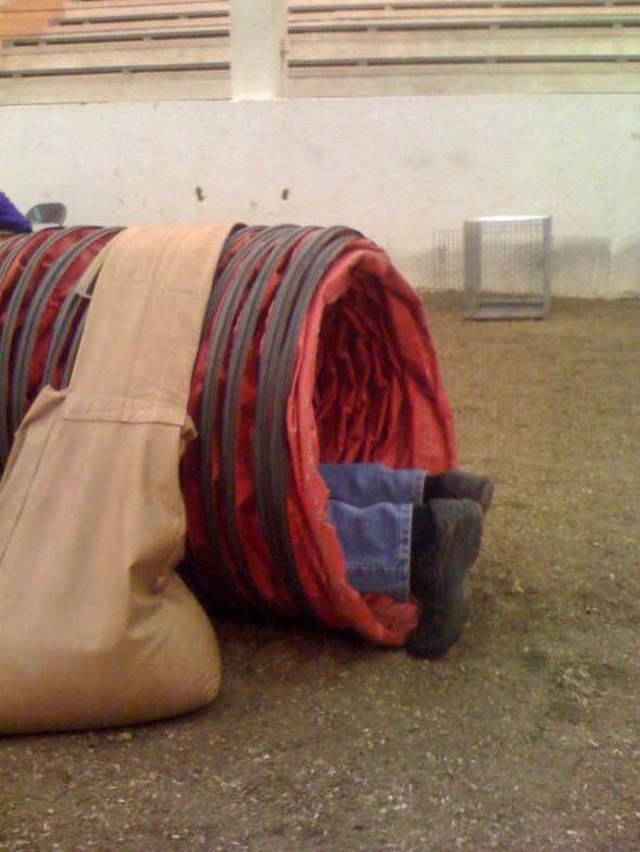 Elliot is at the other end of the tunnel. He’d gone through minutes before and must not have liked the experience. So, I crawled in, attempting to encourage him to come to me. There is no pushing or pulling allowed, so…visiting, yes. Lori was holding Elliot at the entrance of the tunnel. He’s not in the tunnel; the behavior must be offered, not forced. She imitated his slow and steady heart rate, which told me he wasn’t afraid. He just wasn’t going in that tunnel again.