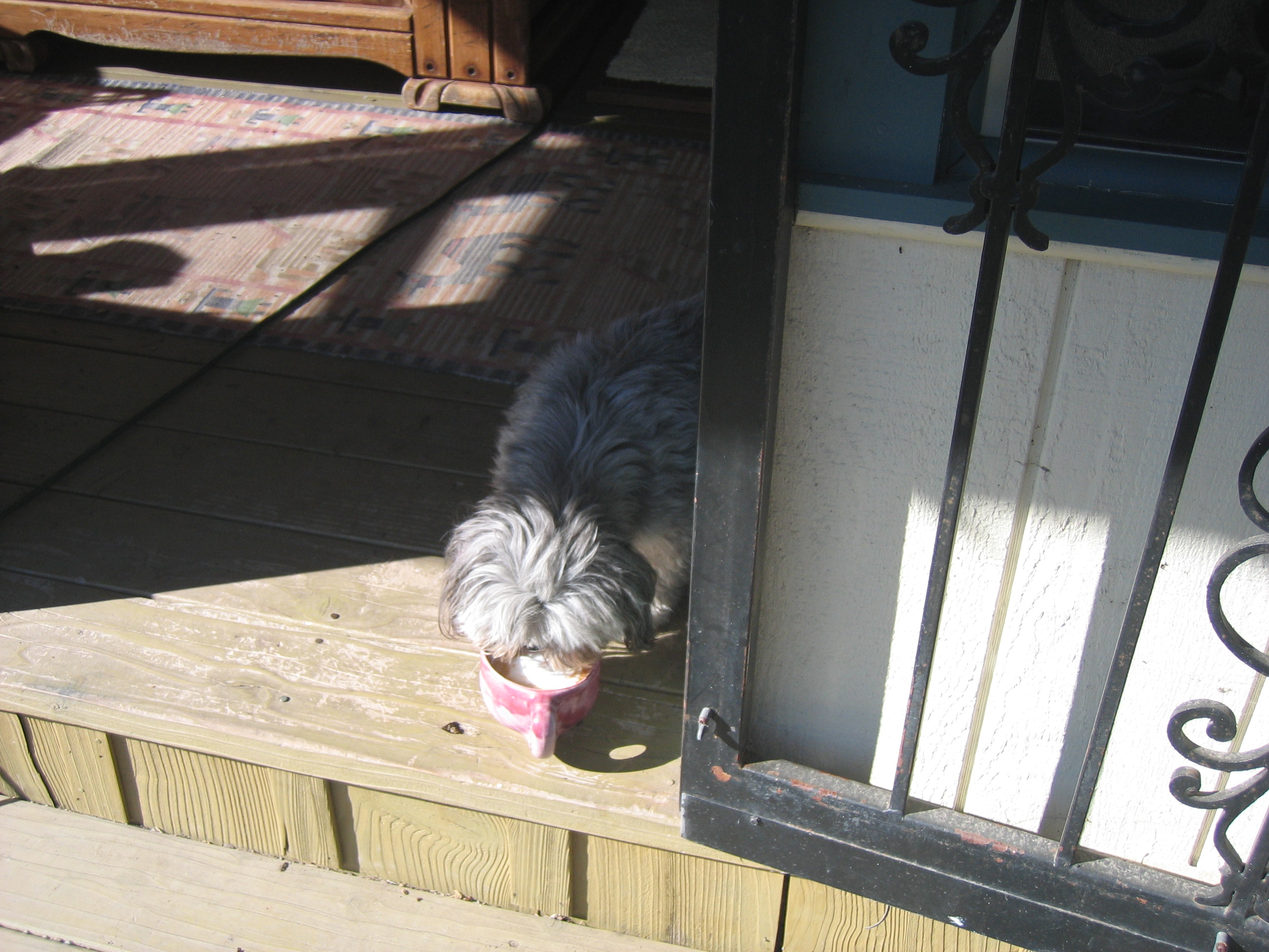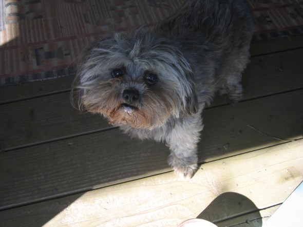 Okay, I have a question about Pony. Maybe you can help. As you know, she is very timid. Although she has been her for two years, there are still ways that she behaves that baffle me. For example, the minute that I get up and head to the sink/stove/island that demarcates the kitchen portion of the main room, she pops out of whatever place she is sleeping in and heads into my room and on out the dog door. She goes around to the south side of the house and hunkers down alongside the foundation. Now, this isn’t a huge problem when it’s sunny and warm, but….she does it even if it’s raining.