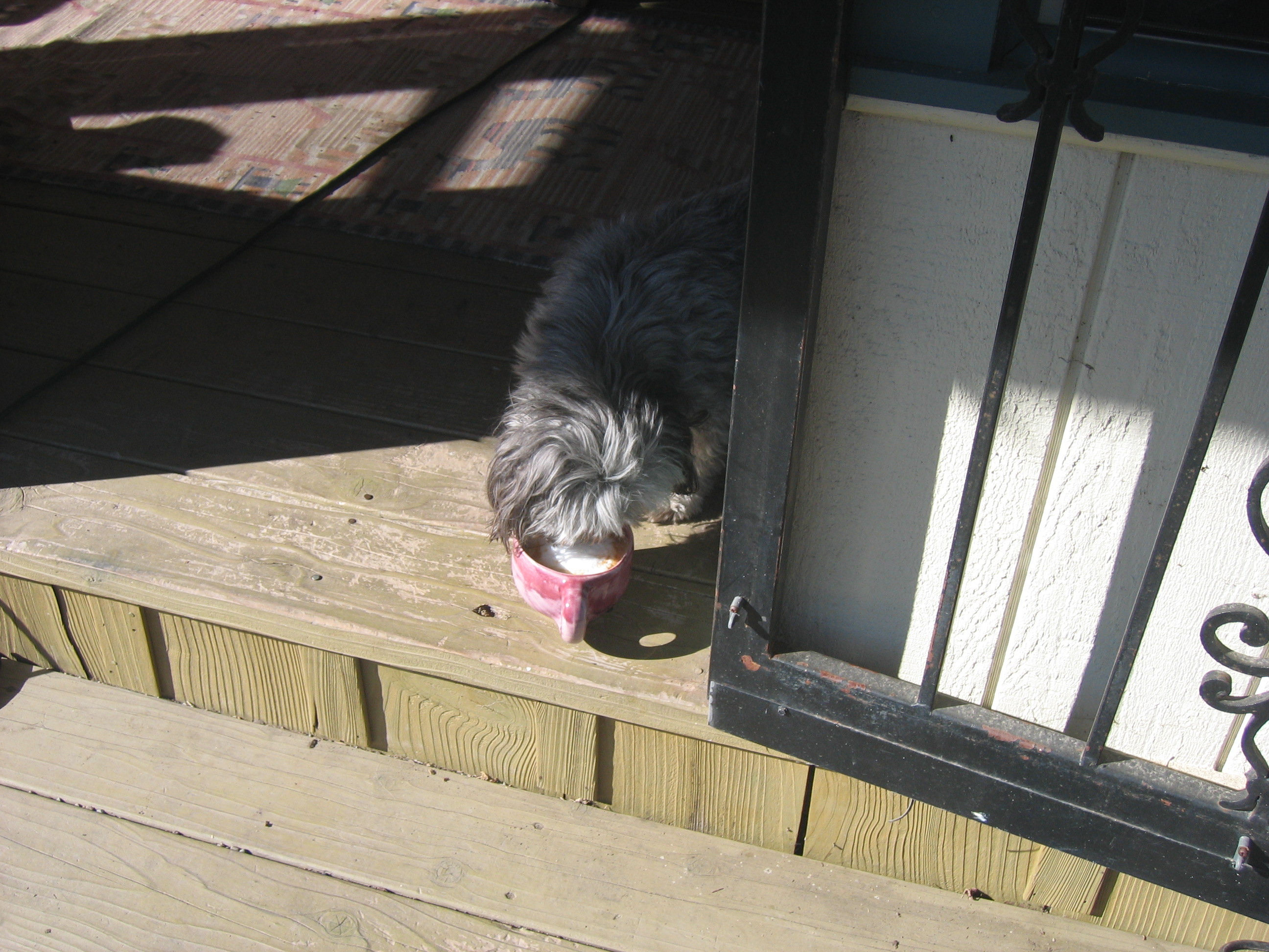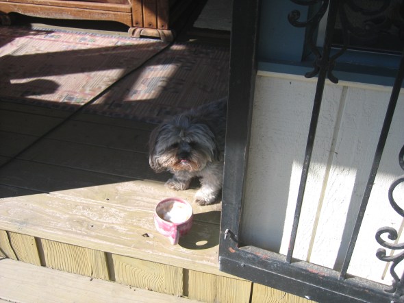 On Friday I stopped at the feed store and bought a 50# sack of alfalfa pellets to spread around the base of the roses. When I got home I popped in the house, made myself a latte, and then went back out to start scooping pellets. I turned around to look at what I had done, and there was Pony greedily chomping down green alfalfa pellets. I shooed her off ineffectually and went on with what I was doing, and a few minutes later turned around to see her washing down her pellets with the latte I had left sitting on a log…..microfoam all over her upper lip. And again this morning I made a latte, went out to do my wander through the yard work, turned back and found my favorite second girl puppy lapping up MY latte. Bad doggie !!! :-)))))) And after I picked it up she kept following me around in an uncharacteristic fashion that I now suspect was her way of waiting for me to put it back down where she could reach it….