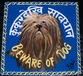 The motto for the Nepal Art Dogs, Folk Art from the Himalayas, is ‘Micro-finance through art patronage!’ There is a tradition in Nepal of ‘beware of dog’ signs. Approximately one foot square, the signs are hand-painted on recycled metal and can be hung indoors or out. According to Michelle, on her most recent trip to Nepal, the Danger Dog commissions were the only art these artists were still hand painting. Their other work is mass-produced, digital or printed on flex.